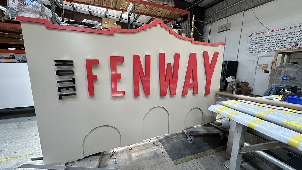 Beyond visibility, the most obvious characteristic — to stand out — and the primary consideration was architectural integration, Weber says. The monument sign was designed to align with the Fenway Hotel’s architectural character, proportions and material language, which CSD was handling as well.