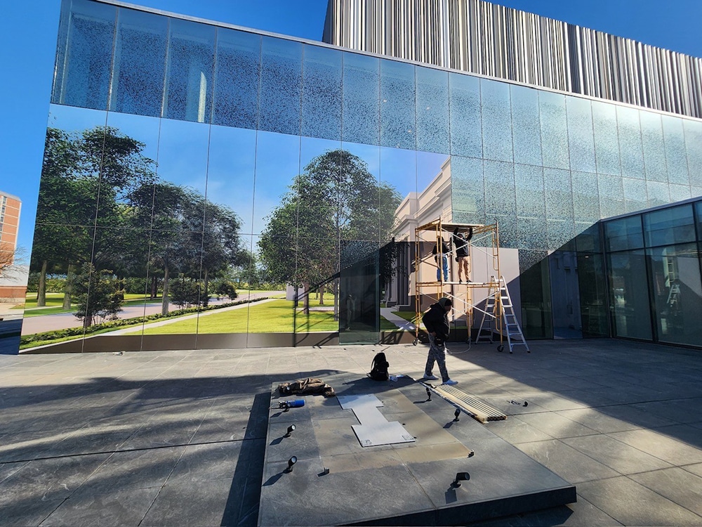 Installing the printed optically clear vinyl showing the completed sculpture garden.