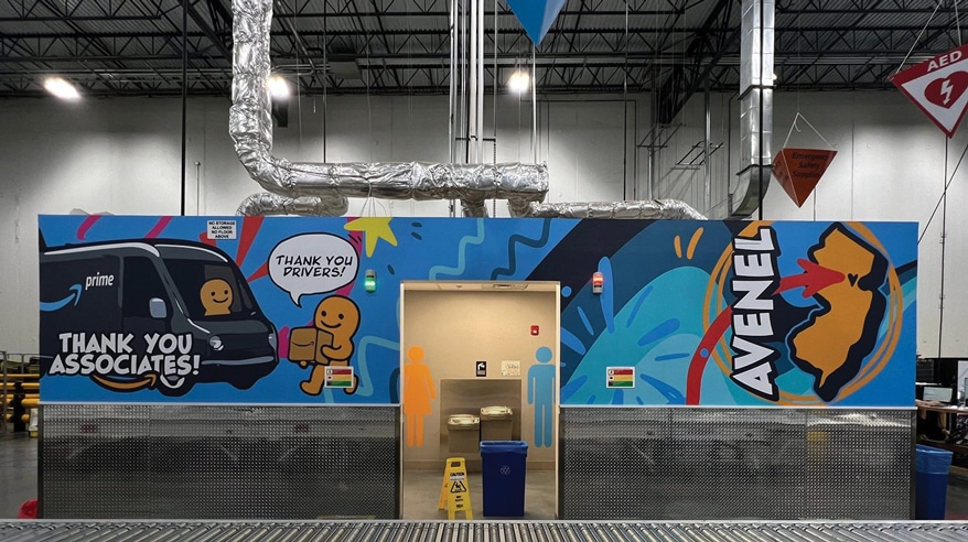 The idea of doing wall murals at Amazon’s DJZ8 fulfillment center in Woodbridge, NJ first came up in a 2021 conversation with Fastsigns of Maple Shade (Maple Shade, NJ), say co-owners Jeffrey and Kimberly Chudoff.