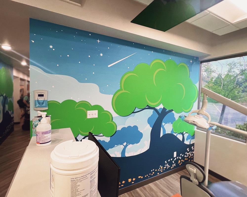 “For Lone Tree Pediatric Dentistry, we transformed two walls using DreamScape textured wall graphics, creating an immersive ‘forest’ atmosphere designed to calm and delight young patients,” she says. “The vivid colors and whimsical starry sky design evoke a sense of wonder, effectively creating a light-hearted and tranquil environment that helps ease children’s anxieties during their dental visits.”