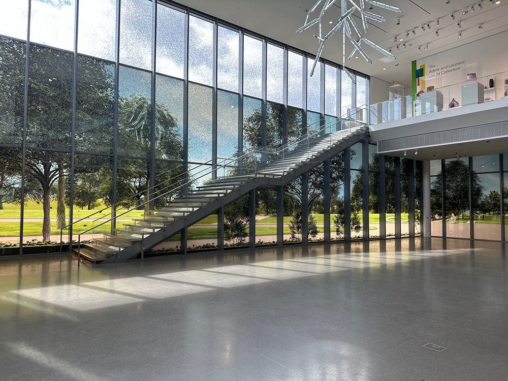 “The museum has a large glass atrium that hosts events like weddings and the construction was going to be highly visible,” she says. They wanted help developing a solution for the windows that would block the construction without completely eliminating the natural light in the space, while also showcasing the future view of the gardens. “We proposed doing a graphic on optically clear vinyl that would be visible from the exterior for passersby and the interior to block construction,” Dixon says.