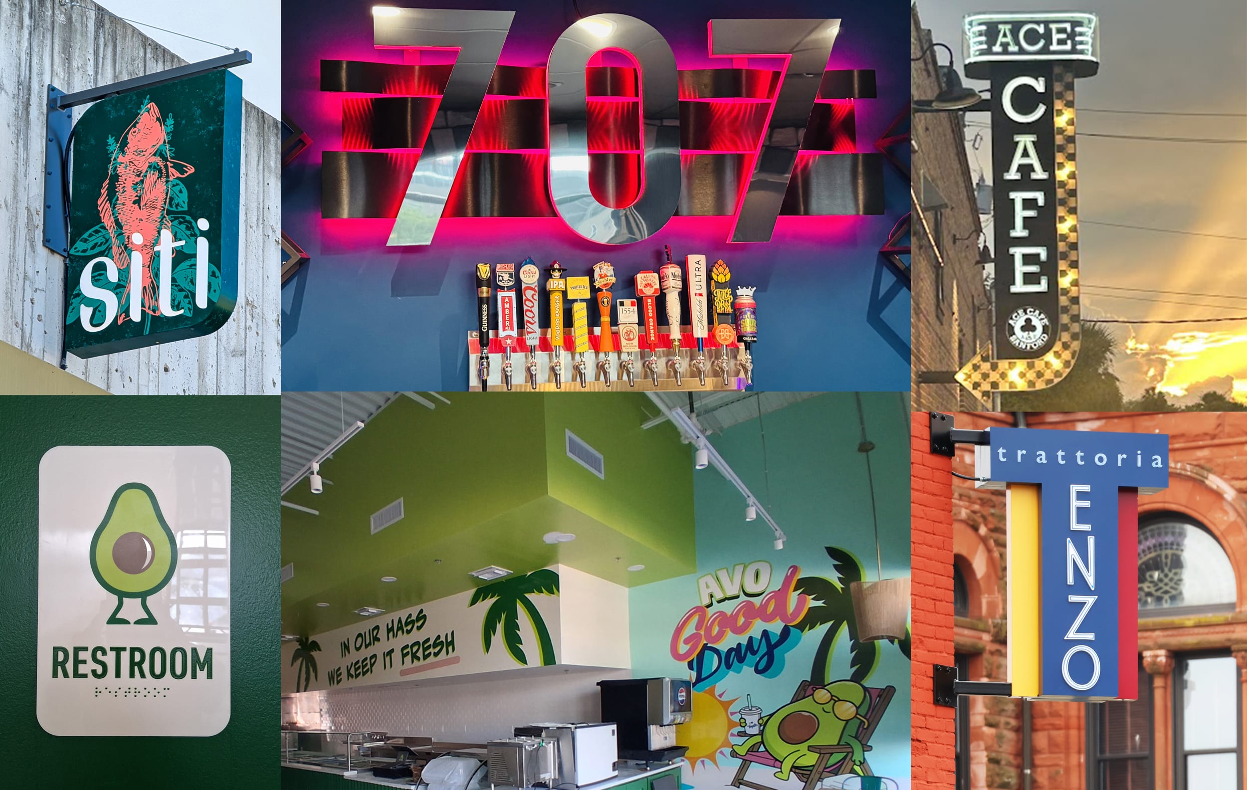 DESPITE OR PERHAPS DUE to living in the age of Uber Eats, restaurants compete hard to establish as a destination. Thus, custom signage to both draw a clientele and convey that first impression is paramount. Settle in with a napkin on your lap as five sign companies fill your plate.
