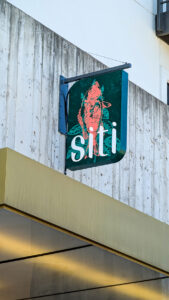 “Being able to develop the brand with the entire space in mind allowed us to consider the existing furnishing, materials and space, and develop a concept, brand identity and brand experience that aligned with the chef, the menu and the entire vision,” says Russell Toynes, partner | creative director, Studio Dzo (Austin, TX), of their work for local Siti Southeast Asian. The sign comprises a 3-in.-deep aluminium custom cabinet with routed-out show-through text backed with white acrylic and illuminated with 3500K LEDs. The custom blade sign mimics vintage hanging blade signs found in Southeast Asian countries, Toynes says.