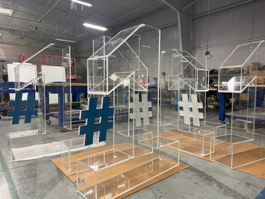 He says, yeah, they want eight 5-ft.-tall “#1’s” made of clear acrylic that can be filled with colored balls with employee names on them to applaud their contribution to the company’s success. They will be displayed in the hospitals’ lobbies. What a great idea! But a very quick turn was needed.