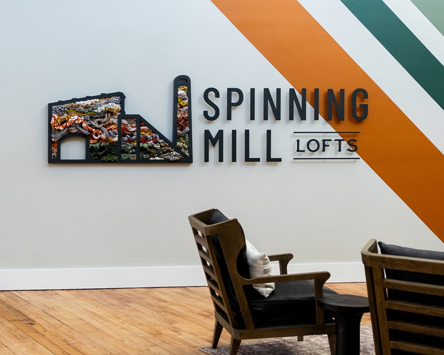 Lauren Stern of Studio 618 was hired to design signage for the Spinning Mill Lofts, a renovated 1901 textile factory in North Carolina. While the scope was defined, Lauren felt the project demanded more. A passionate weaver, she saw an opportunity to bridge the building’s legacy with her personal craft. Despite initial worries about “scope creep,” Lauren pitched a custom fiber art installation integrated with the branded interior signage.