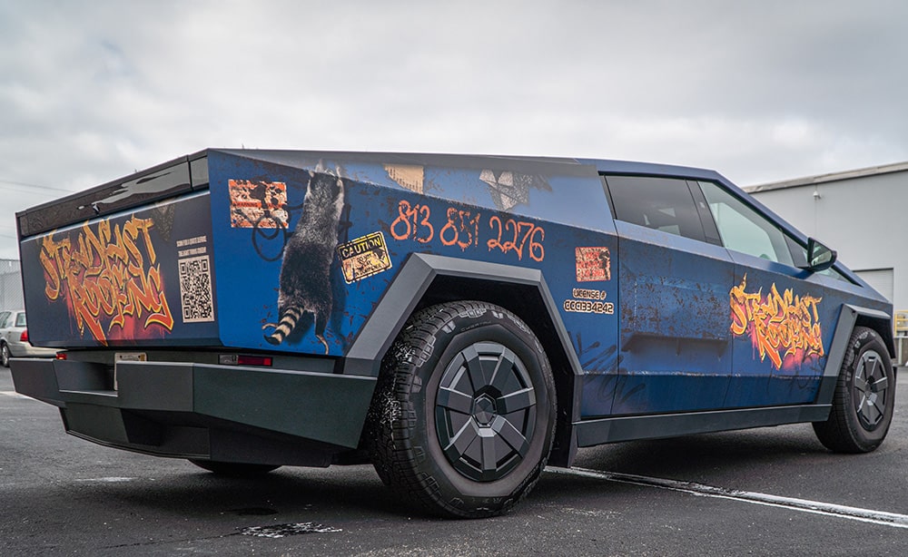 Who says work trucks can’t turn heads? Steadfast Roofing came to us with a vision — take a cutting-edge Tesla Cybertruck and make it look like the toughest, grimiest dumpster on the block. Challenge accepted.