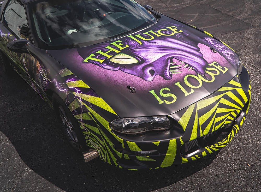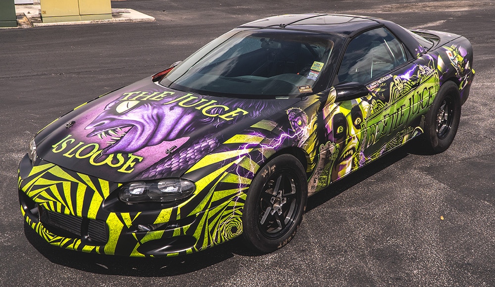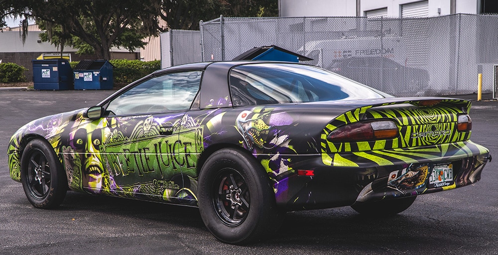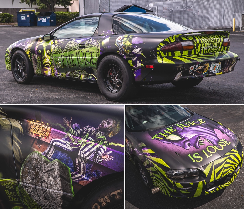 It’s strange. It’s spooky. It’s show-stopping. James Reynolds brought us a Camaro and asked for a wrap that screams character — and there’s no character louder than Beetlejuice himself.