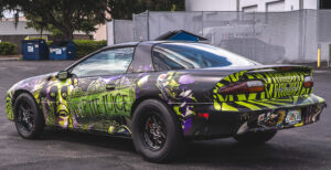 This full custom wrap transforms James’ 4th Gen Camaro into a rolling tribute to Tim Burton’s cult classic. We combined the film’s signature black-and-white stripes with twisted textures, eerie greens, sandworm graphics, and that unmistakable ghostly vibe. It’s part hot rod, part haunted, and 100% attention-grabbing.