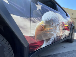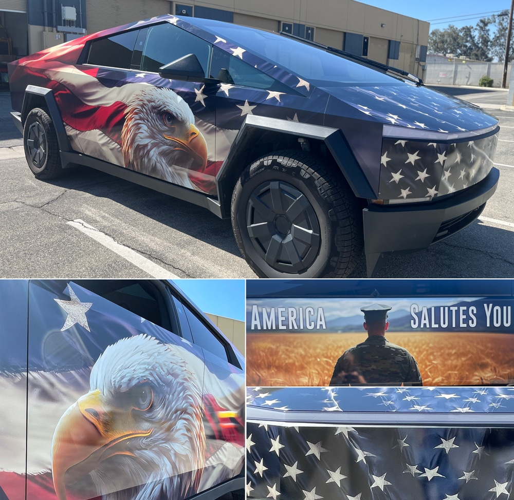 Our client wanted to pay tribute to our servicemen and women. They were looking for something that could be used in their 4th of July Parade. Taking inspiration from WWII P40 fighters with shark teeth painted on their noses, we integrated a watchful and ready bald eagle to the sides of the truck and tried to give the impression that our flag was wrapped around the front and flowing around the sides.