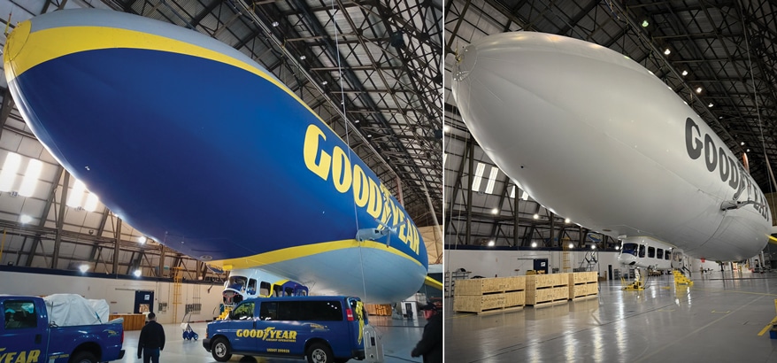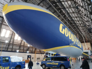IN JUNE 2021, Goodyear Airship Operations (Mogadore, OH) contacted nearby Central Graphics (Akron, OH) after seeing the shop’s marketing email featuring wraps for kitchenettes, walls, appliances and more. Central’s Director of Sales Joseph Kist followed up on the inquiry, assuming Goodyear was interested in graphics for their cafeteria, but when he arrived at their facility, he was escorted deeper inside. Along the way, someone noticed the tape measure he was carrying and said, “That won’t help you for this project.” Finally, Kist reached some hangar doors. As they opened, he found himself face-to-face with a Goodyear Blimp, docked with its nose pointed straight at him. That’s when the Goodyear folks said, “This is the project we called you about…”