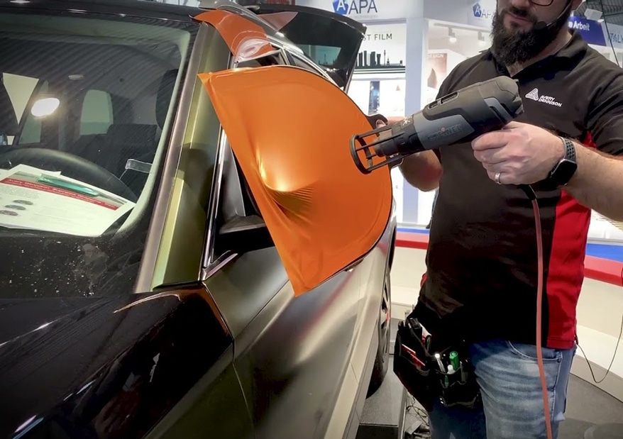 Finally, let’s talk about our vehicle wrap shops. By now you know about most of the special knives, blades and squeegees. However, a common problem is wrapping those pesky protruding surfaces like mirrors. It can take two people to get everything lined up and adhered. Now you can get tools that hold small wheels of vinyl that can be preheated and placed over the surface, almost like vacuum forming. Once in place, it’s a simple job that one installer can do to squeegee and trim.