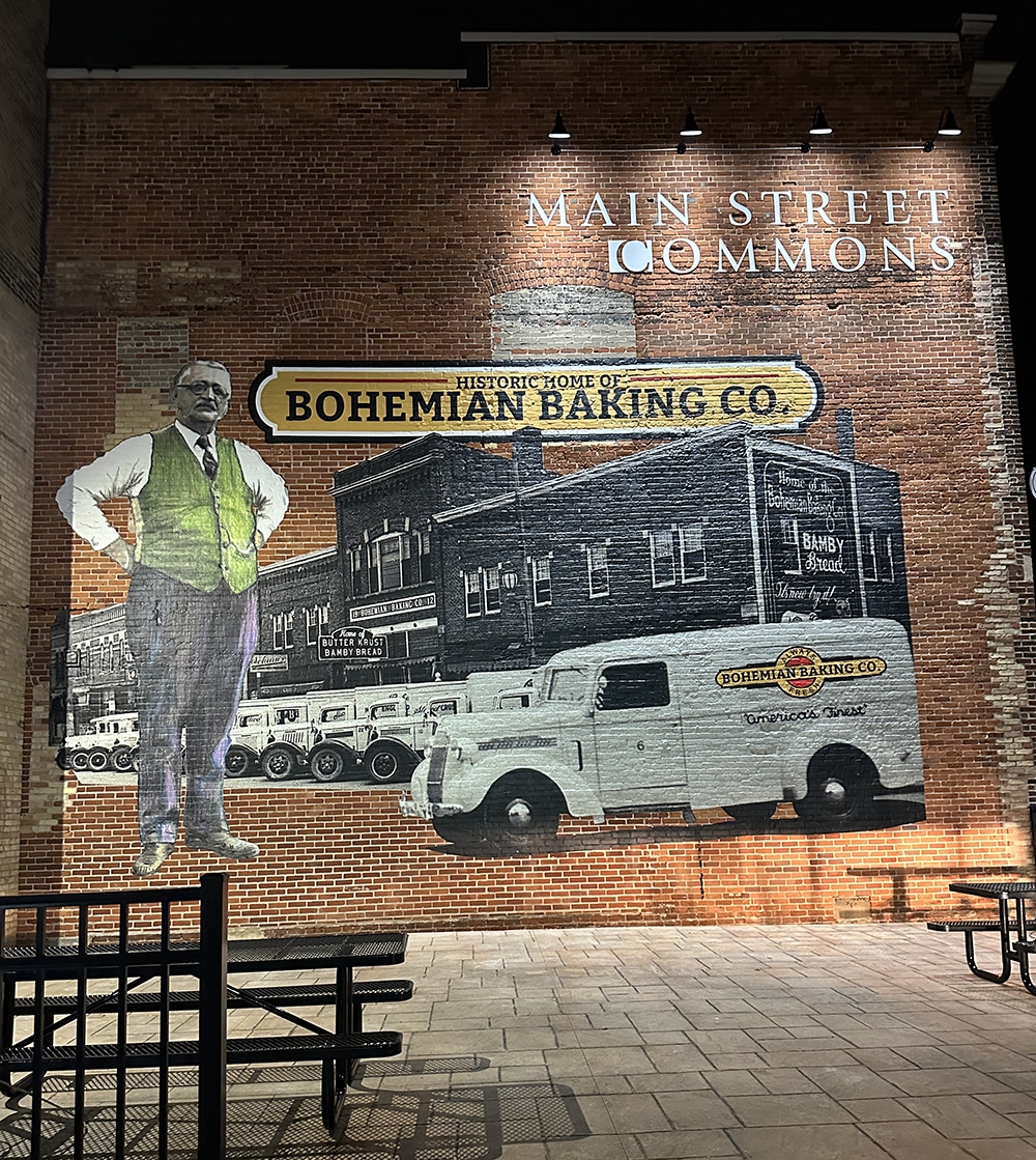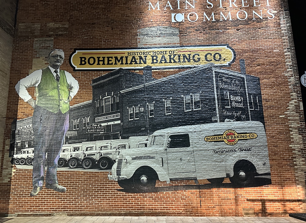 “I wanted to highlight the height of the building using the founder of the Bohemian Bread Co.,” he says. Scale and perspective were also considered while creating the collage. “In the process of laying these things out, I was also conscientious of putting hand work back into the visual through inking and coloring,” Marquardt says. “Placing the human essence back into the print was an important part of the piece, which is located in a historic neighborhood of downtown Green Bay, a place known for its community and host of characters that helped build the city.”